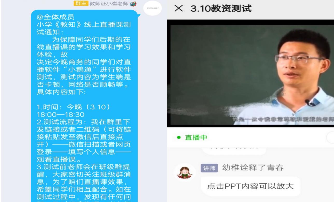 课前进行QQ视频电话、小鹅通等软件测试直播效果,安排各班级教学计划