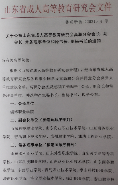 3月31日,山东省成人高等教育研究会高职分会成立大会暨高职院校继续教育工作会议在山东理工大学举行,山东理工大学及全省67所高职院校领导代表出席会议,我校当选为成人高等教育研究会高职分会副会长单位。