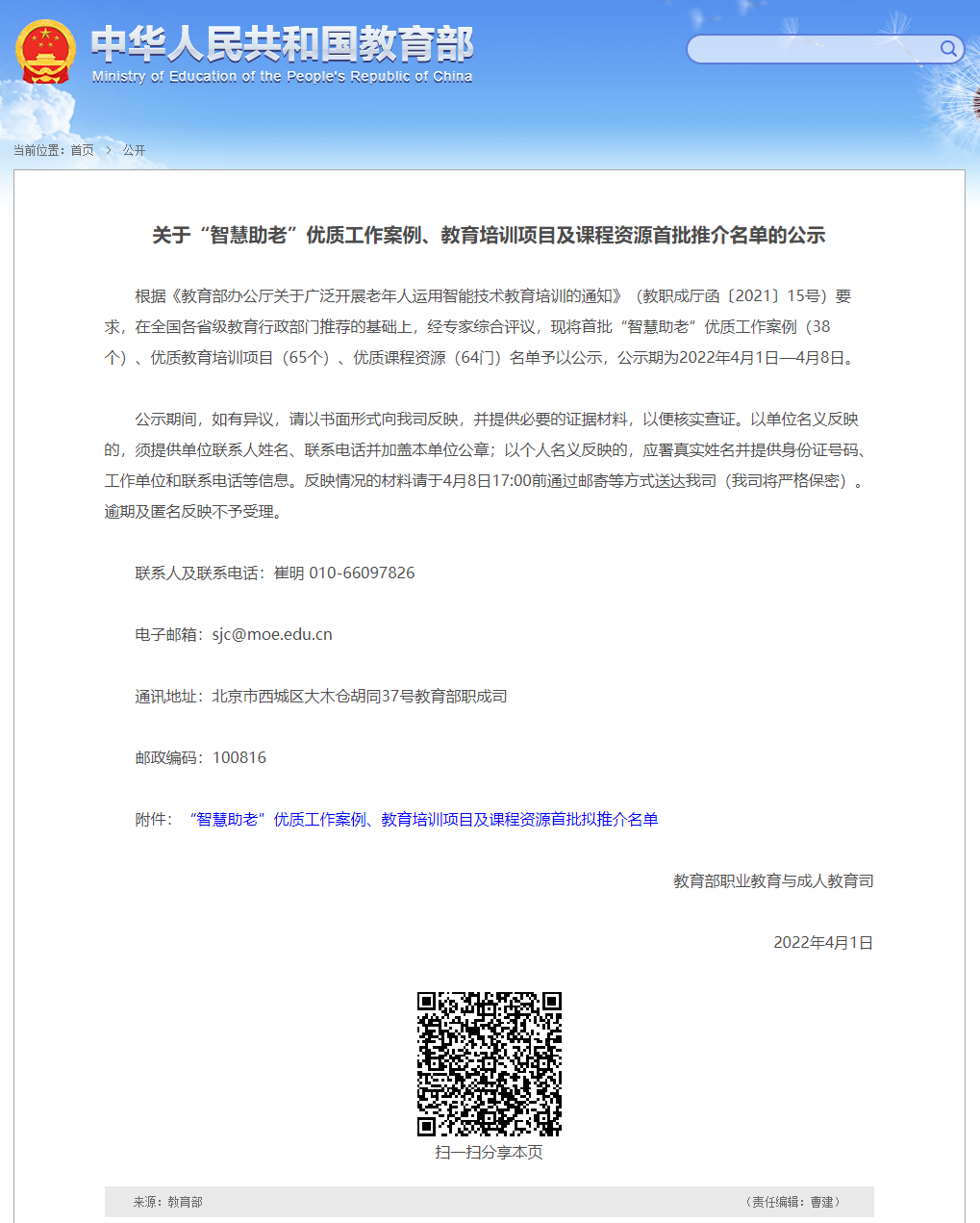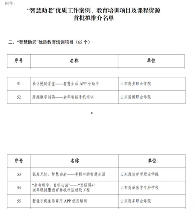 日前,教育部公示了首批“智慧助老”优质工作案例、优质教育培训项目、优质课程资源推介名单,我校2个项目入选。