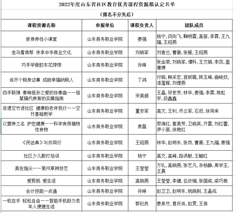 近日,山东省教育厅公布了2022年度山东省社区教育优秀课程资源遴选结果,我校姜强、刘晓军、丁鸿等13位老师主持的课程成功入选,入选数量在全省高校中名列前茅。