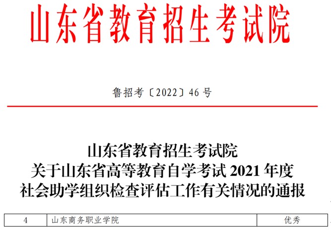 近日,山东省教育招生考试院公布了省高等教育自学考试2021年度社会助学组织检查评估结果,我校获优秀等次。同时,在鲁招考[2022]46号文中的“先进经验”一栏,对我校在自学考试生源发动方面的经验做法进行了推广。