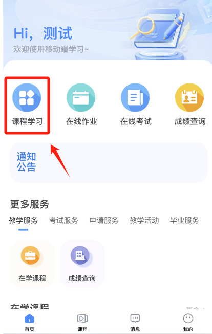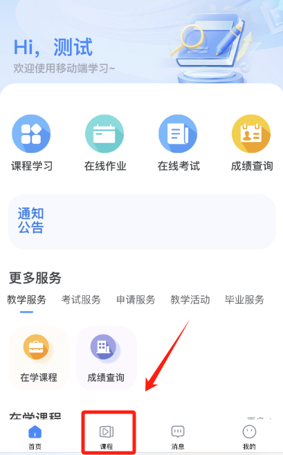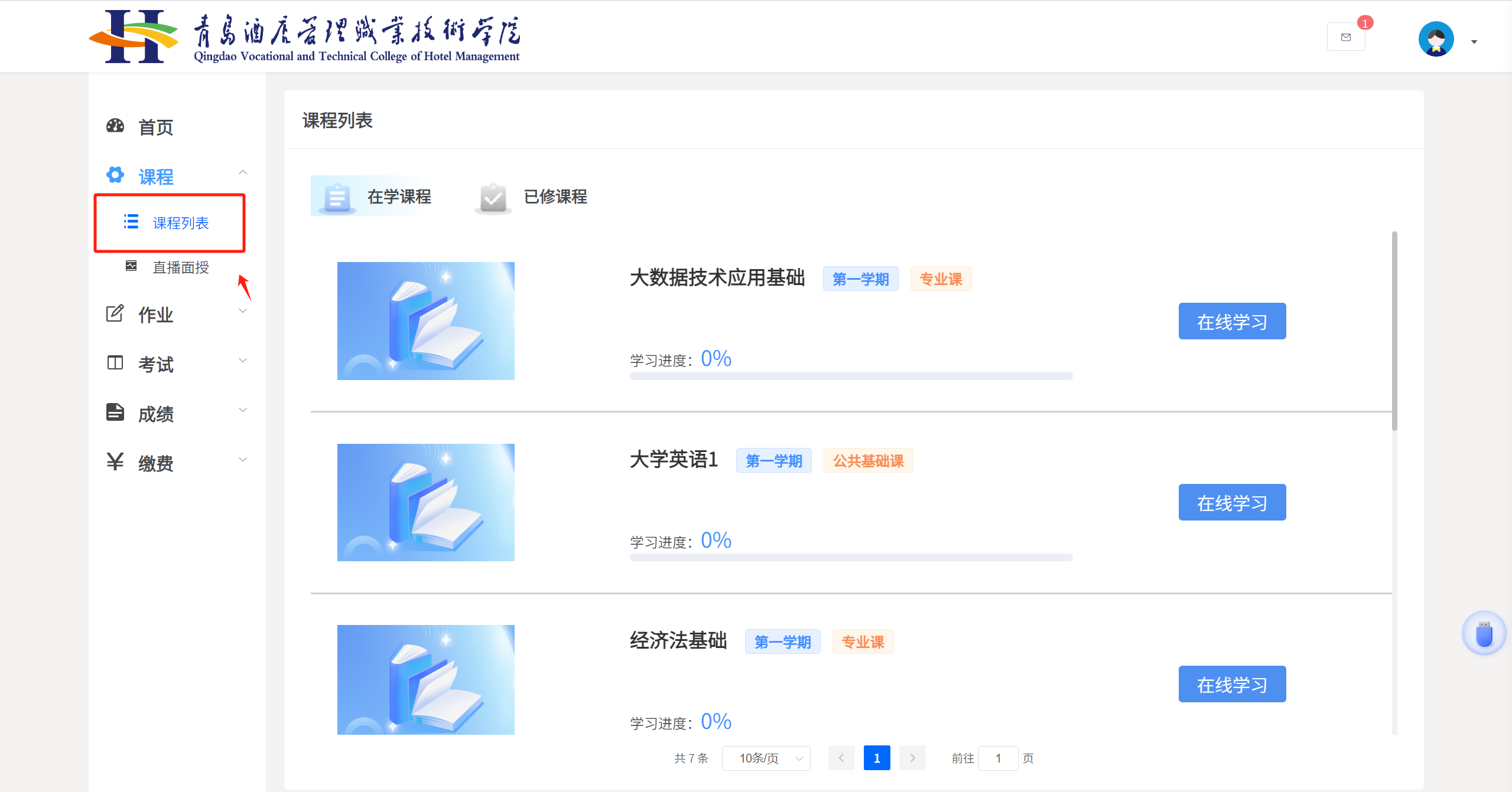 4.返回首页,点击左下角的“课程”,即可显示在修所有课程及学习进度。