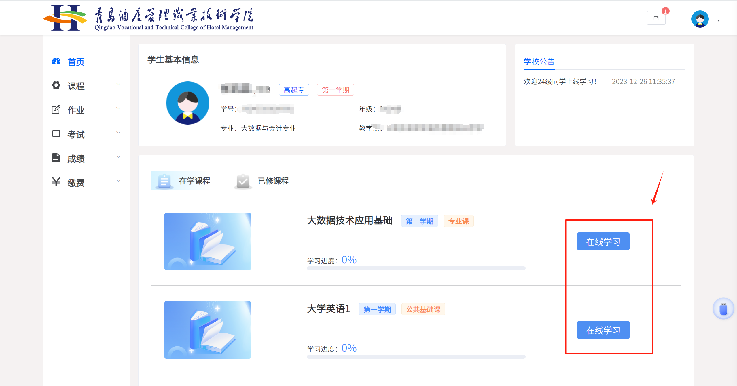 3. 登录学习平台后可以在首页看到自己当前学期需要学习的所有课程,选择一门课程,点击开始学习即可进入学习界面。
