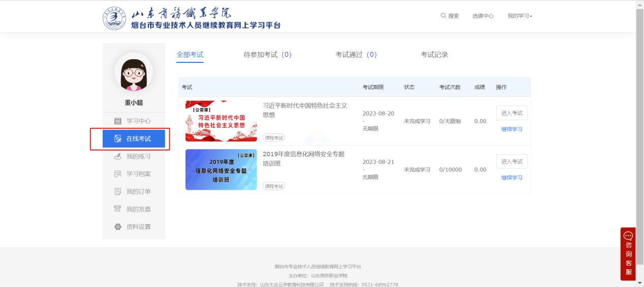 5、考试:根据要求公需科目课程学习完成后,在“在线考试”模块完成在线考试,考试通过后,学员即可获得学时;