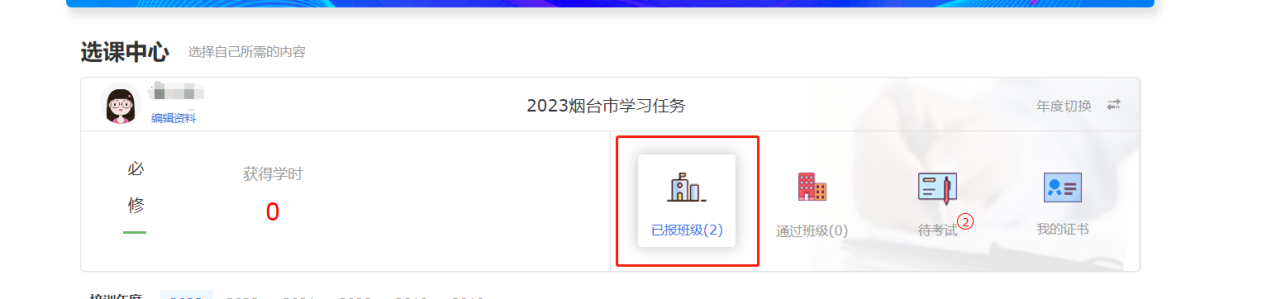 4、选课学习:学员登录平台后,会到达选课中心界面,平台配置近五年公需科目及专业科目课程,以供学员自主进行选择。学员选中班级,进行缴费,缴费后即刻开通班级,已开通的班级会在已报班级中体现,学员点击此处就可进行课程学习;