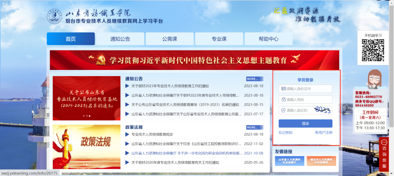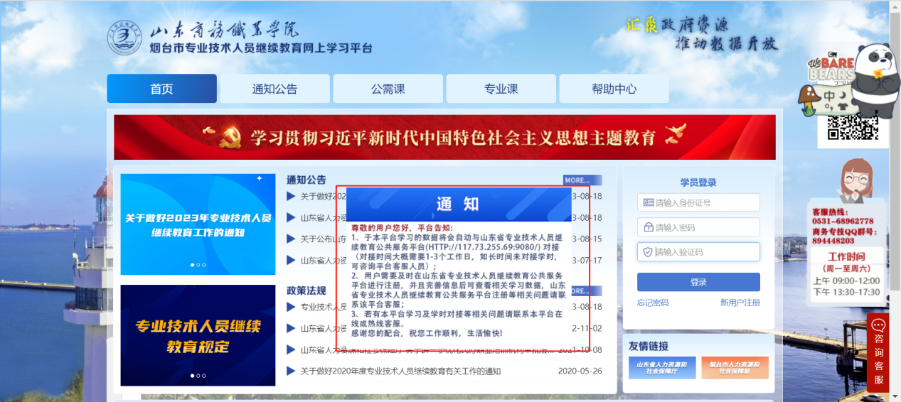 7、学时对接:本平台已与山东省专业技术人员公共服务平台完成平台对接工作,在本平台完成学习后的1-3个工作日内会完成学习数据的对接,若有数据对接的相关问题可咨询服务热线或在线客服;