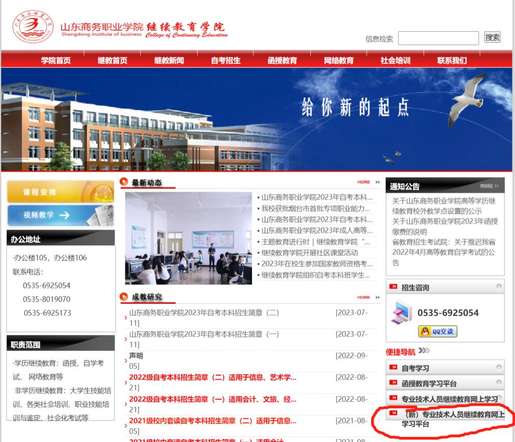 1、登录方式一:在浏览器中搜索并打开山东商务职业学院继续教育学院官网,点击右侧“(新)专业技术人员继续教育网上学习”按钮,进入山东商务职业学院专业技术人员继续教育网上学习平台。原平台同步保留,待新平台8月25日更新完成后停用。